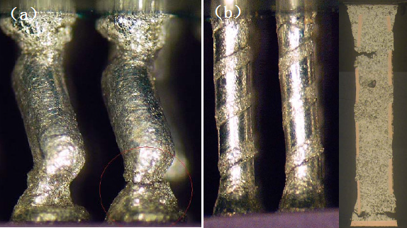 圖 9. 焊柱失效模式圖 (a). 普通錫柱 (b). 螺旋錫柱